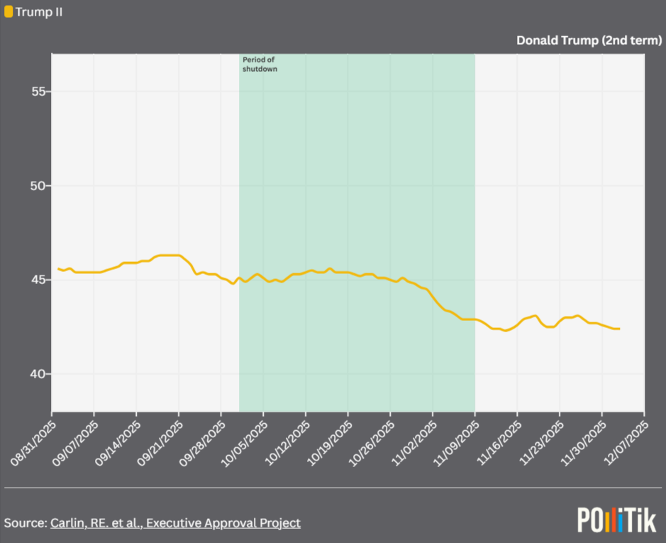 Within the 10 days before the 2025 government shutdown, Trump’s approval trended downward but stayed above 45%. It 43% when it ended. After the government reopened, Trump’s approval fell further to 42.4% and has remained below the pre-shutdown level, behind which there are 3 factors.