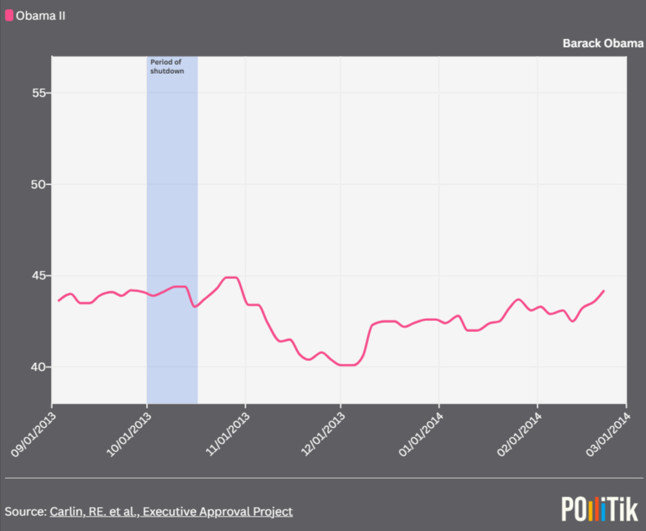 Obama’s approval had dropped to 43% by the time the shutdown ended. Although congressional Republicans received most of the blame for the standoff, Obama was not completely insulated from public frustration. After a Senate compromise reopened the government, Obama’s approval recovered temporarily to 45% before it eroding to and remaining below pre-shutdown level for several months.