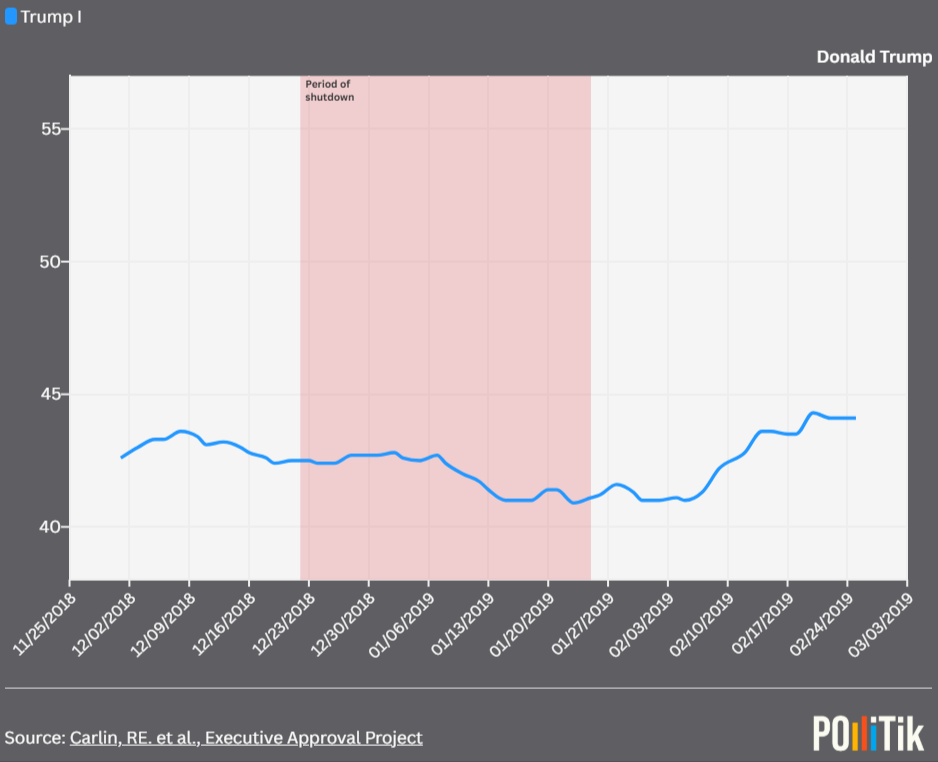 Trump’s approval stayed above 42% during the first half part of the shutdown but fell to about 40% by the shutdown’s end. Afterwards, Trump’s popularity rose to 44% within a month.